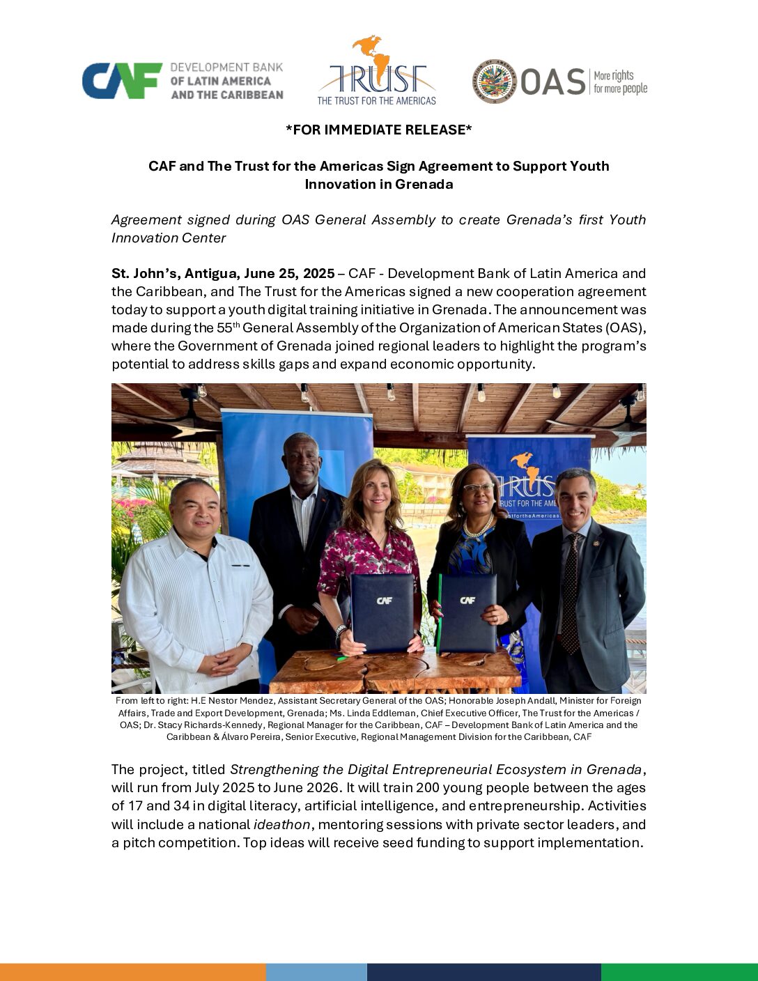 AGREEMENT SIGNED DURING OAS GENERAL ASSEMBLY TO CREATE GRENADA’S FIRST YOUTH INNOVATION CENTER June 27, 2025 by Embassy of Grenada in Development, Embassy Events, Embassy News, Government, Press Release