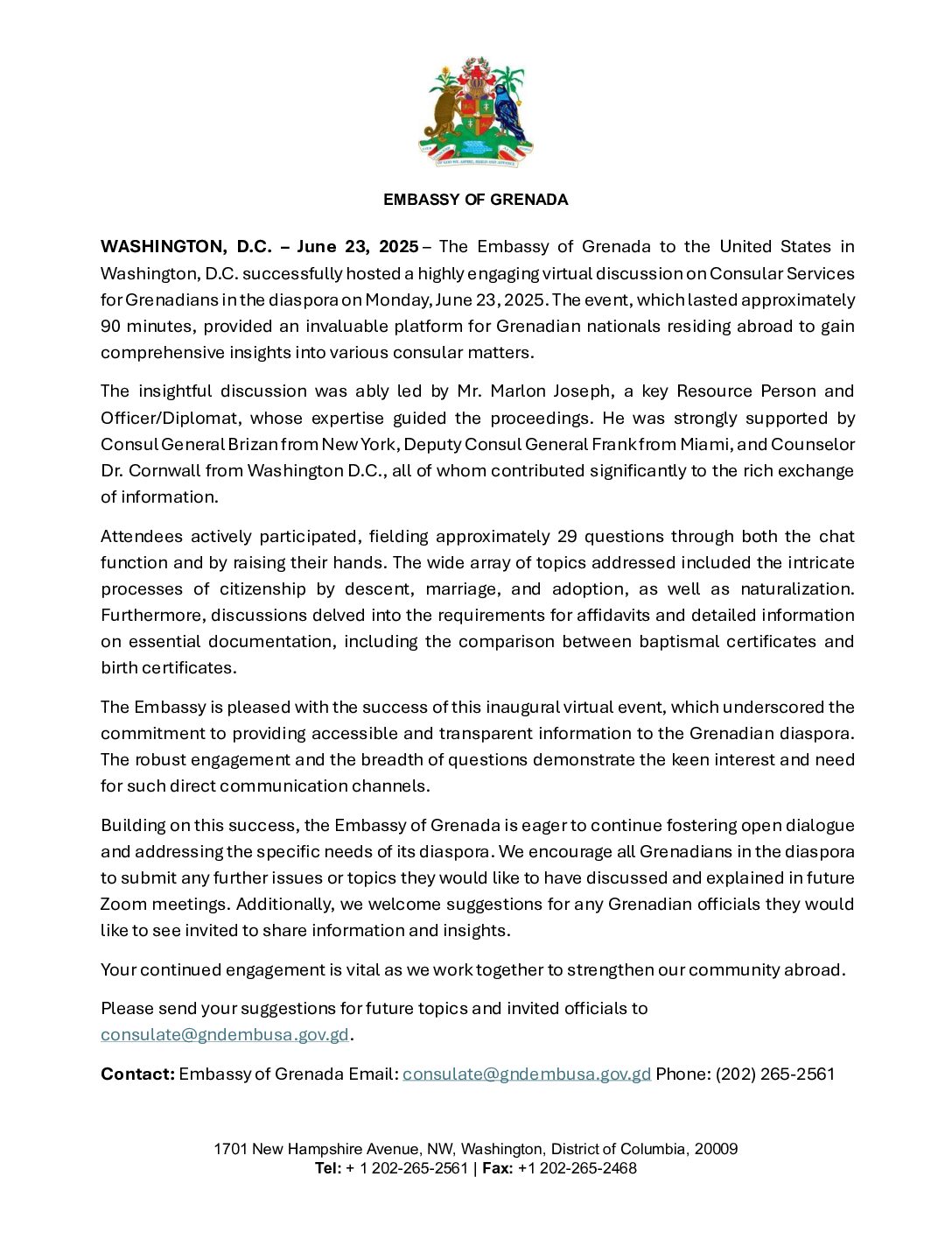 Embassy of Grenada Hosts Successful Virtual Discussion on Consular Services for the Diaspora